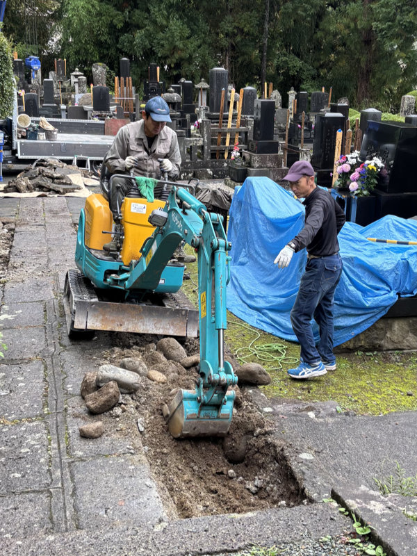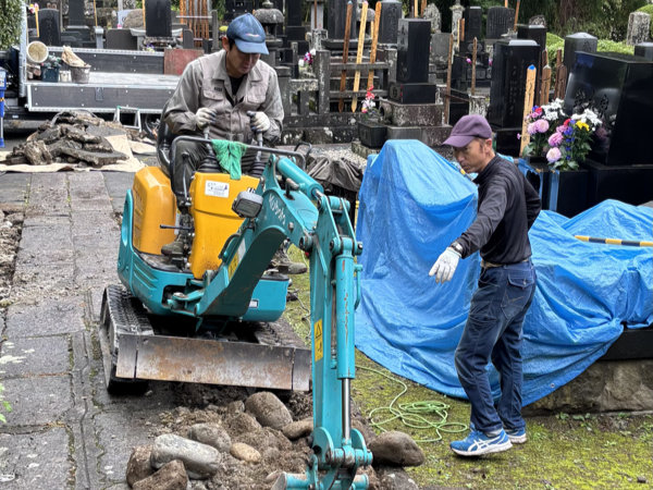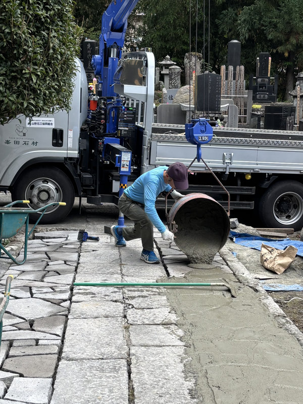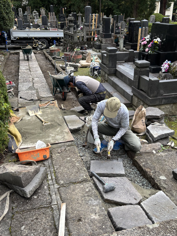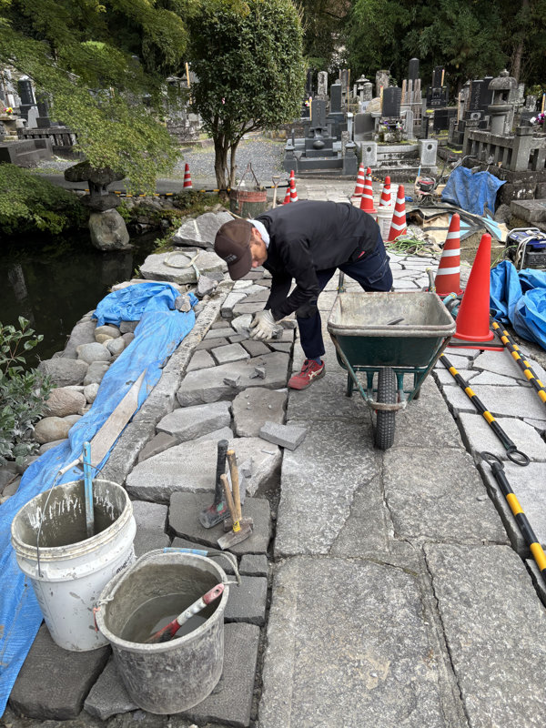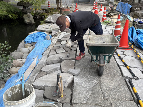 一つ一つ石を割り、形を考えながら張っていく. . . 非常に手間のかかる仕事。石工はもちろん檀家の峯田石材さん。