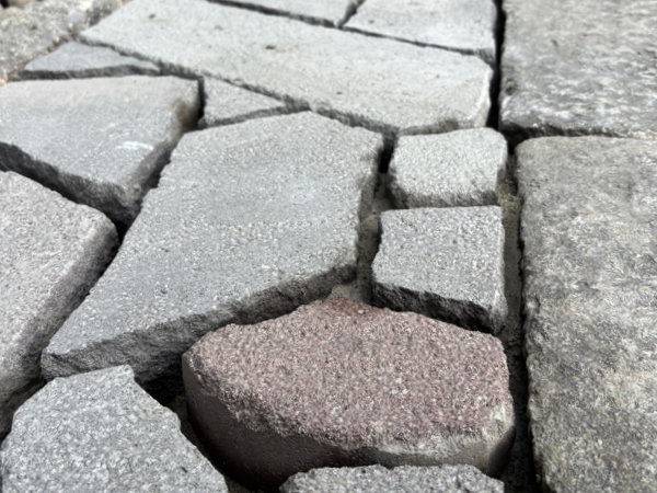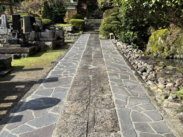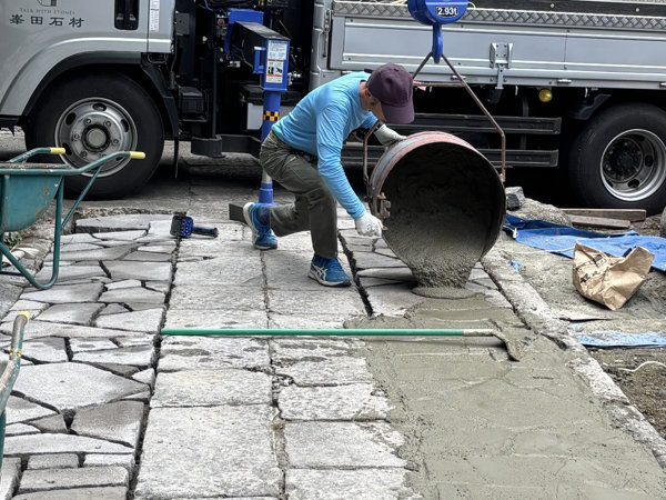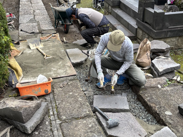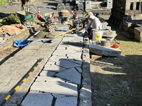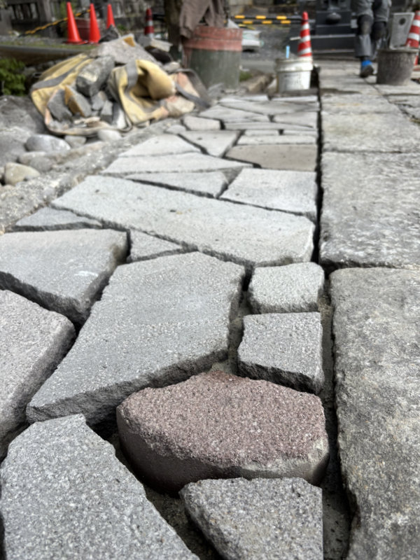 参道中央に敷かれた石 (山寺石,みかげ石) はそのまま残し、コンクリートだった場所に様々な形の蔵王石をはめていく「乱張り」。