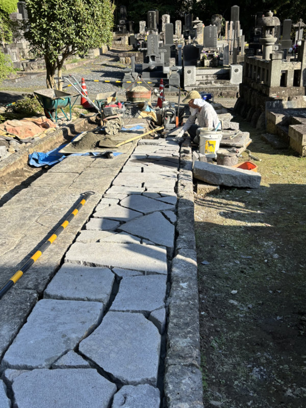 参道中央に敷かれた石 (山寺石,みかげ石) はそのまま残し、コンクリートだった場所に様々な形の蔵王石をはめていく「乱張り