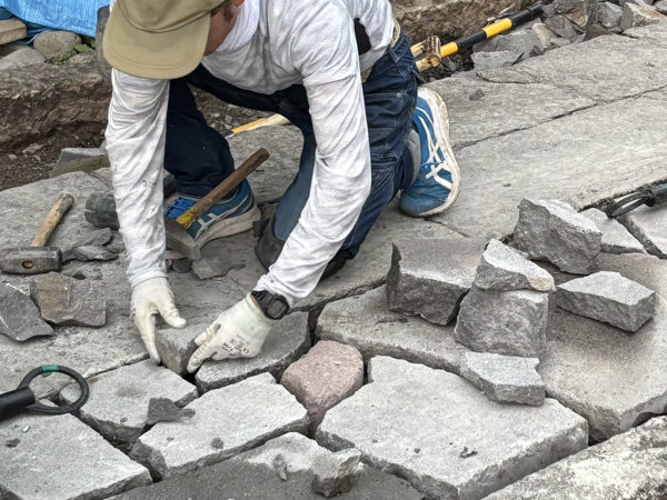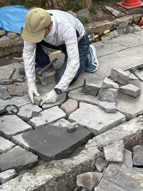 一つ一つ石を割り、形を考えながら張っていく. . . 非常に手間のかかる仕事。