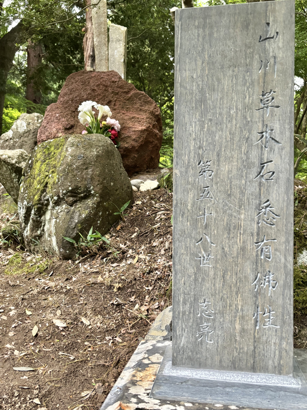 石塔前の銘板に刻まれた「山川草木石悉有仏性」. . . 山川草木、石までも悉く仏が宿る。生きとし生けるものは、