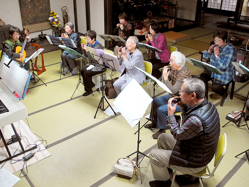 住職のもと、本堂にてお稽古。各種施設への訪問演奏を行っています。