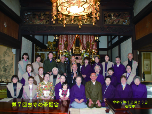 お寺でお稽古している、和讃会・オカリナ教室・茶道教室の合同懇親会〝おてらの茶話会〟。今回は石行寺本堂にて開催しました。
