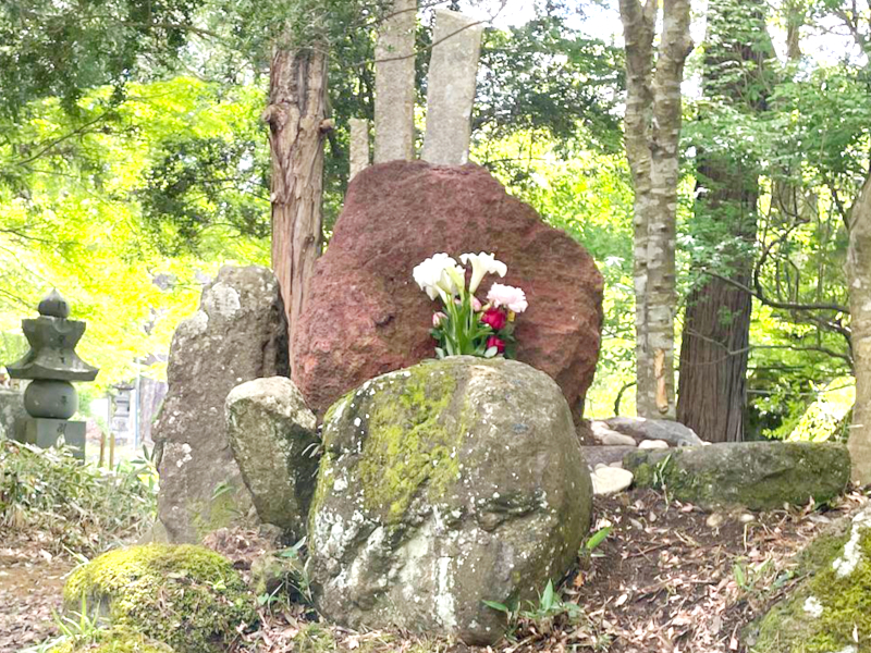 山川草木、石までも悉く仏が宿る。湿度によって赤褐色の色合いを変える瀧山の凝灰岩を用いて、令和7年に建立。