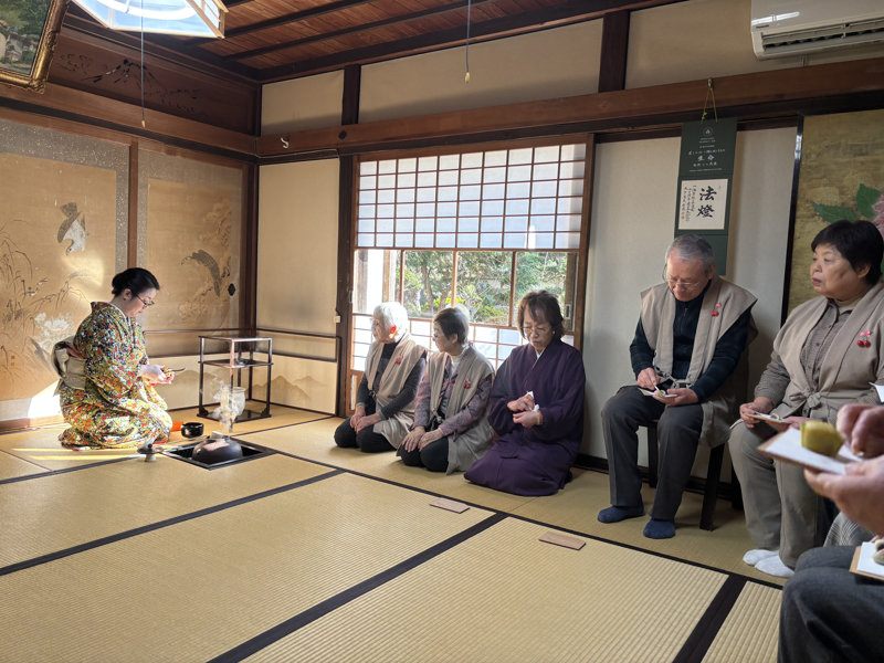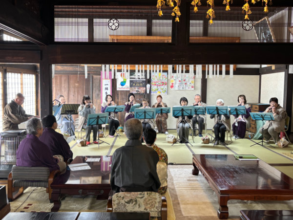お寺でお稽古している、和讃会・オカリナ教室・茶道教室の合同懇親会〝おてらの茶話会〟。今回は石行寺本堂にて開催しました。